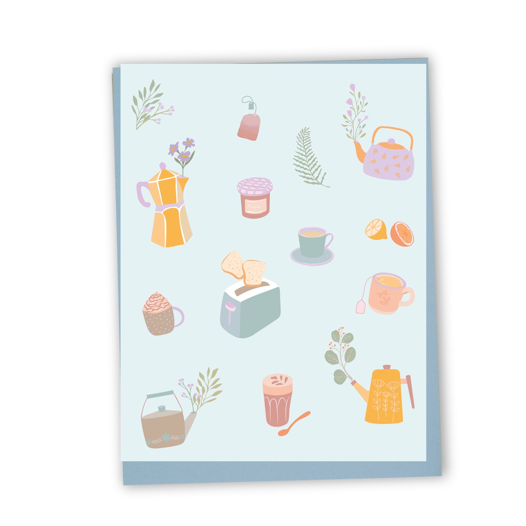 Lots of coffees, fresh bread, a nice orange ready to be squeezed...all of our favorite things for a perfect breakfast gathered in a sweet and simple greeting card.