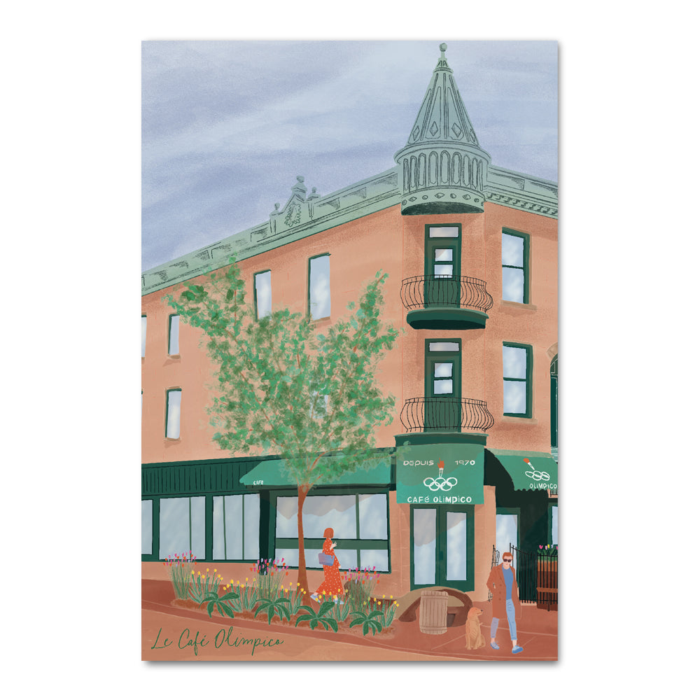 The iconic Café Olimpico, located in the Mile-End, now available as a postcard.