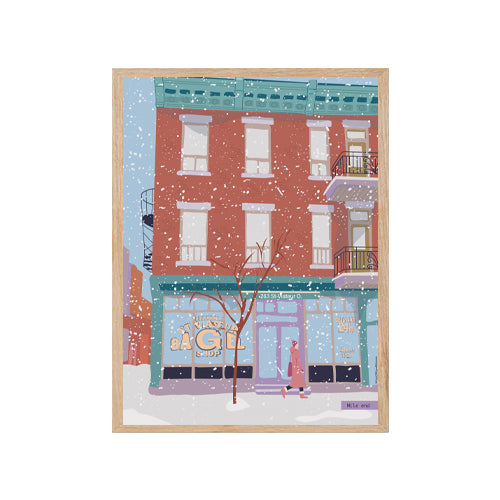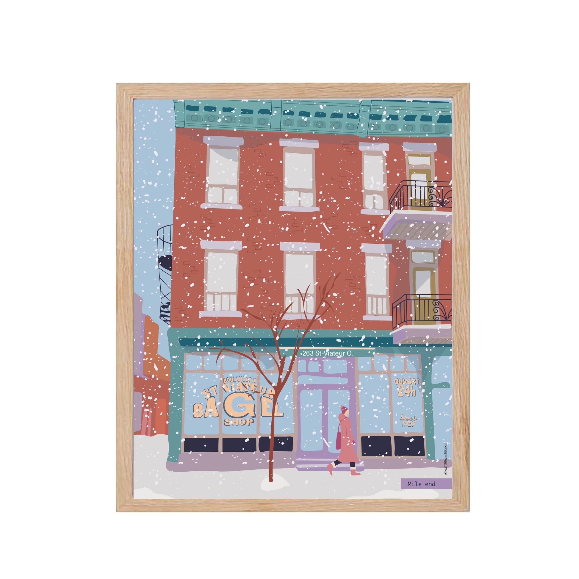 Laissez-vous transporter dans notre quartier préféré, le Mile End, avec cette affiche murale décorative illustrée par Marie-Laure Plano, illustratrice montréalaise. Cette illustration hivernale capture la magie des rues enneigées du Mile End, avec sa célèbre boutique de bagels, un véritable symbole de Montréal, entourée par la beauté tranquille de l'hiver montréalais.