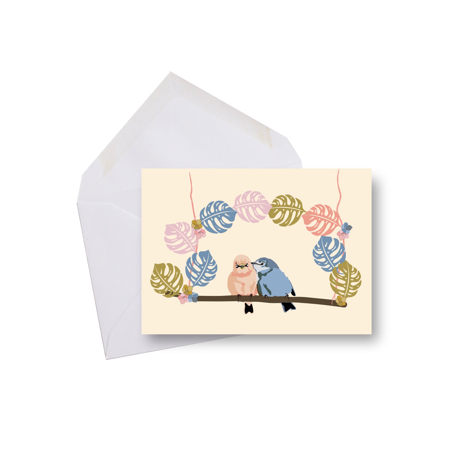 Un adorable couple d'oiseaux colorés symbolisant le mariage, à offrir aux jeunes mariés pour leur souhaiter tout le bonheur du monde.