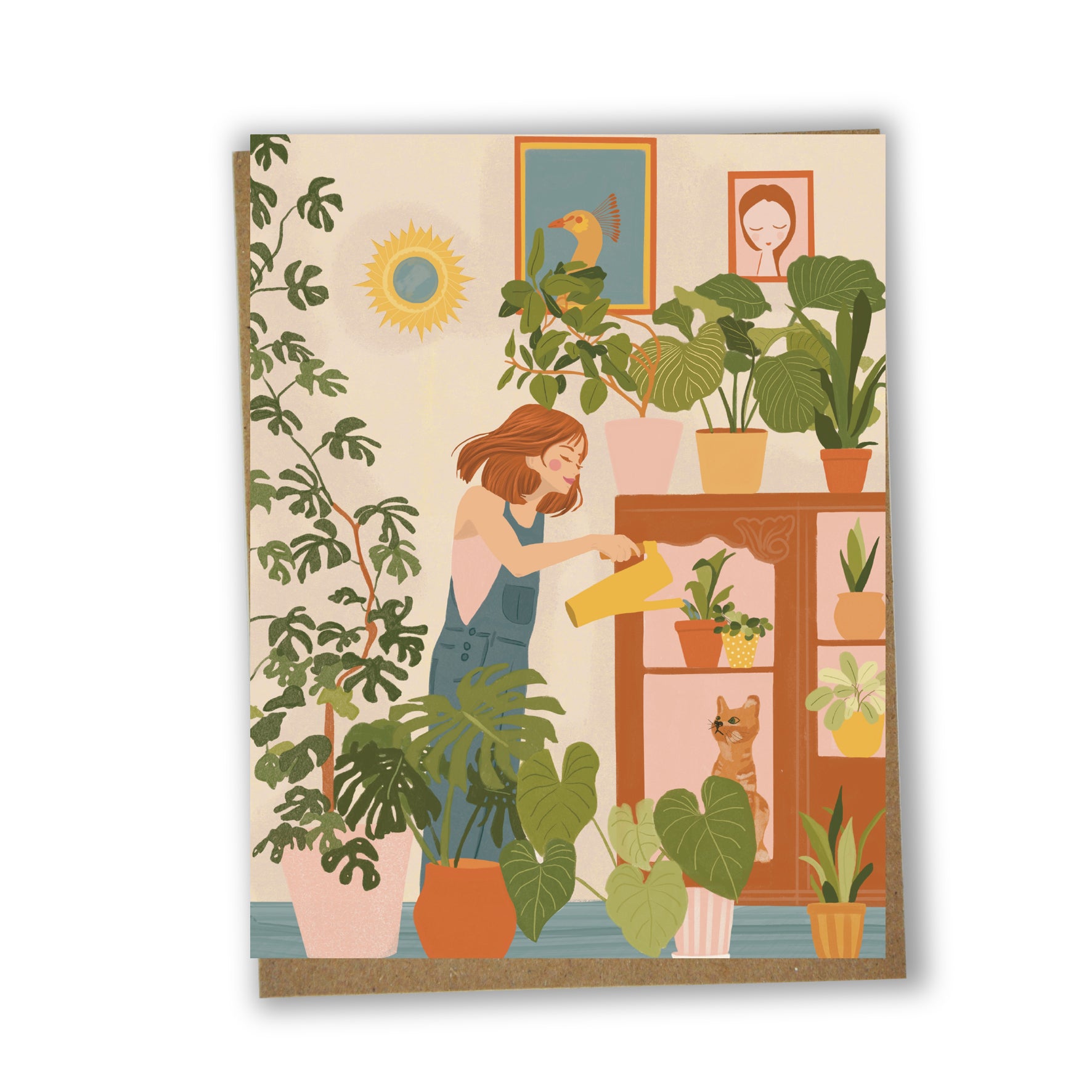 Une scène de douceur végétale pour les amoureux·ses des plantes : cette carte de souhaits illustrée montre une femme sereine dans son salon, entourée de feuillage luxuriant, arrosoir en main. Son chat, caché dans un coin, complète cette ambiance paisible et joyeuse. Sans texte, elle se prête à toutes les occasions : remerciements, pensées tendres ou simple mot doux.