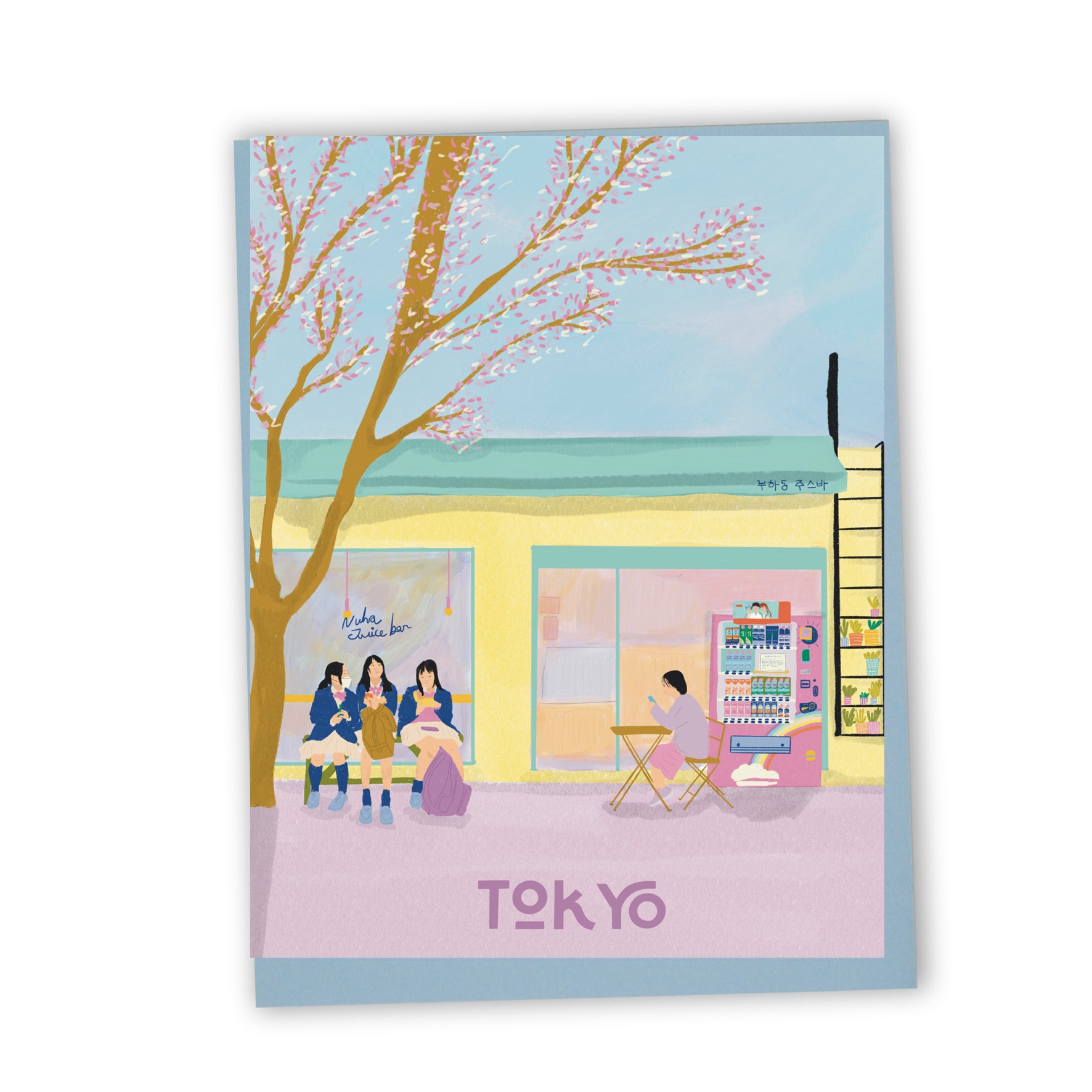 Sous les cerisiers en fleurs, une scène de vie quotidienne à Tokyo prend vie dans cette carte illustrée signée Marie-Laure Plano. Devant une façade pastel, des jeunes en uniforme, un distributeur automatique et une terrasse miniature évoquent avec justesse l’ambiance douce et urbaine de la capitale japonaise. Une carte poétique et dépaysante, idéale pour faire voyager vos mots et offrir une pensée délicate.