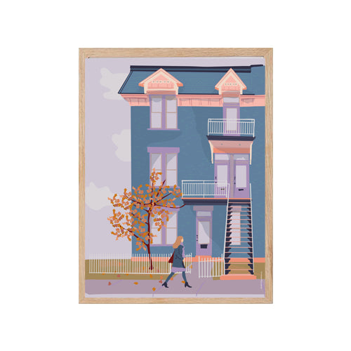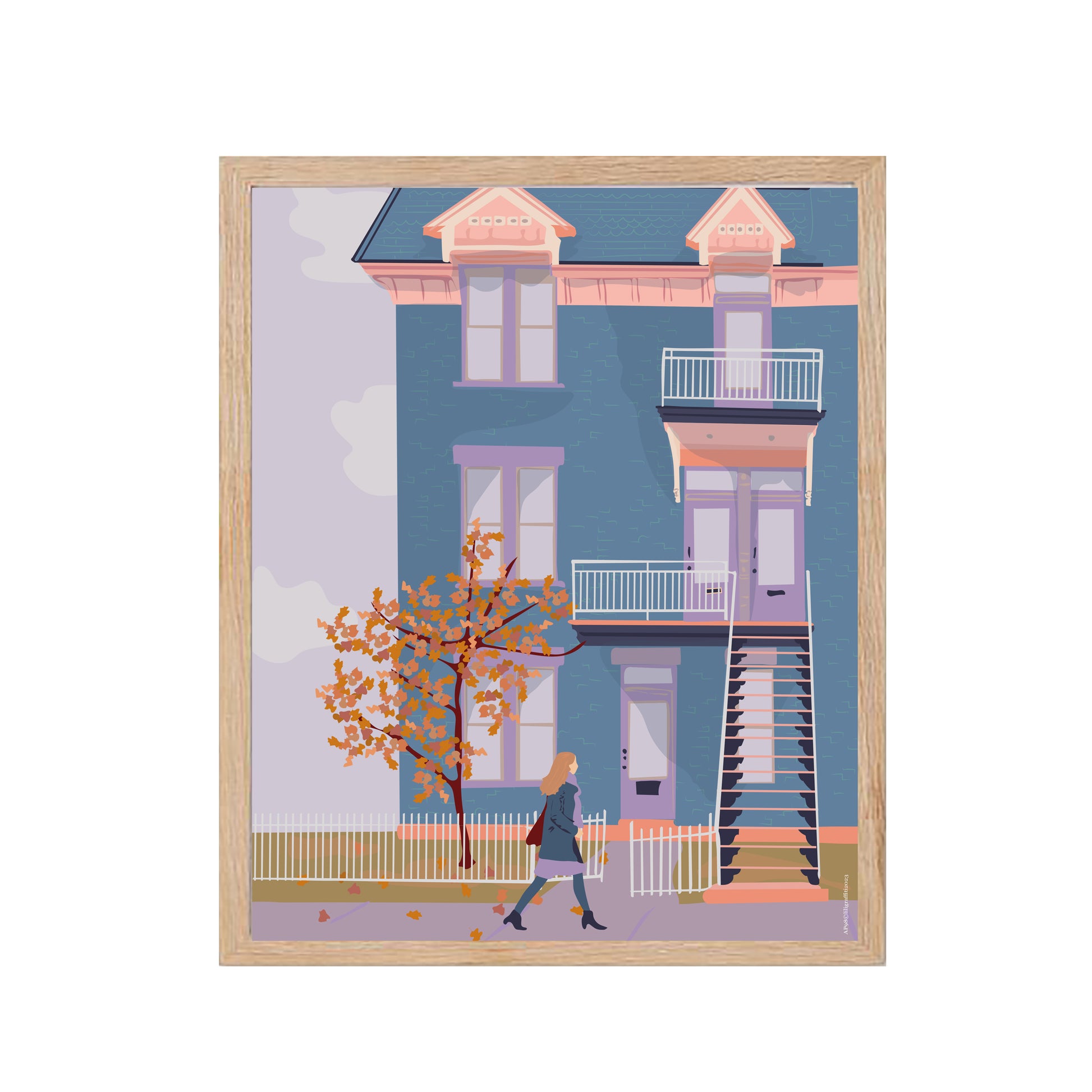Laissez-vous transporter dans les rues colorées de Rosemont en automne avec cette affiche murale décorative, signée Marie-Laure Plano, illustratrice montréalaise. Cette illustration capture la beauté des arbres en feuillage et des ruelles charmantes de ce quartier montréalais, évoquant l’atmosphère paisible et chaleureuse de l’automne à Montréal.