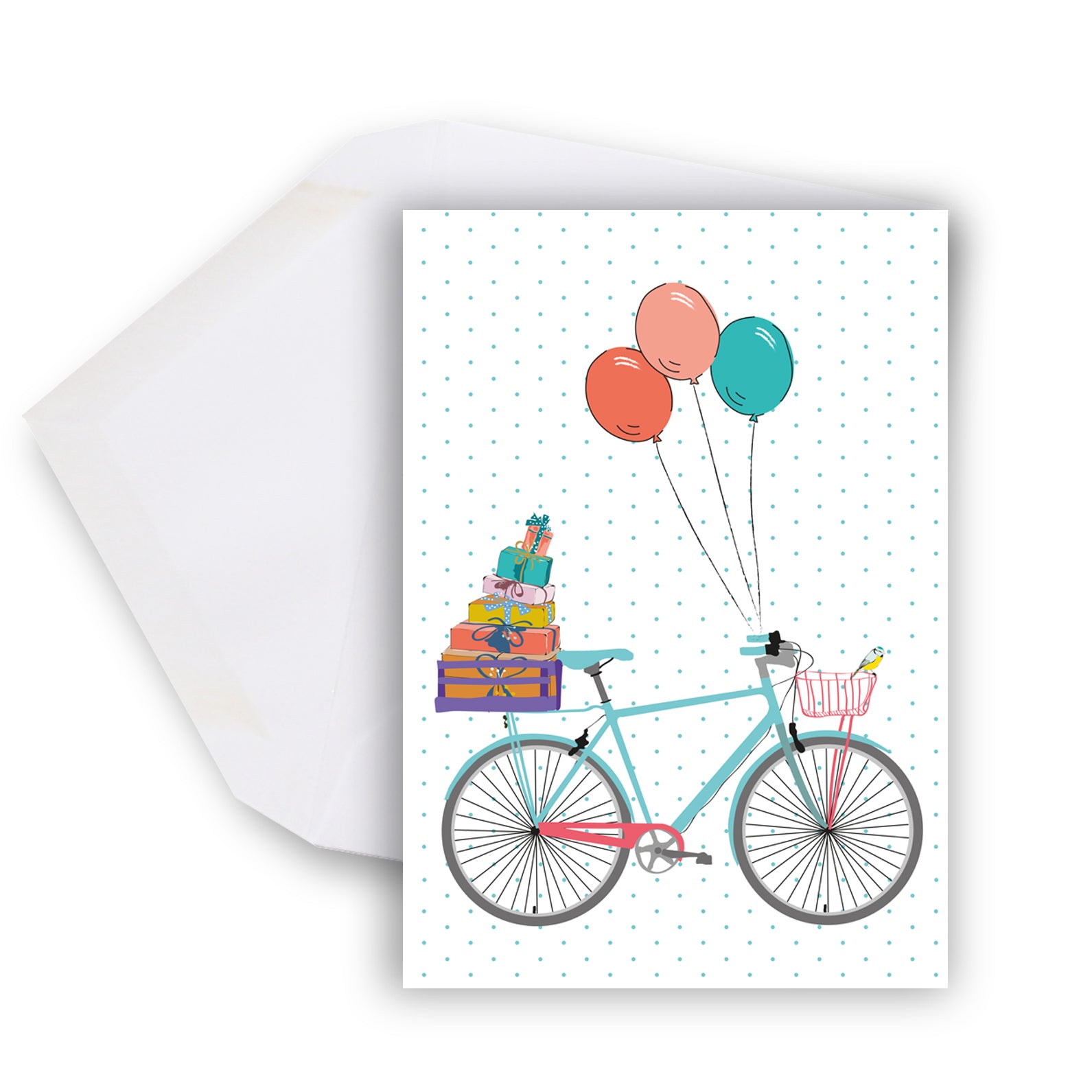 Une bicyclette remplie de ballons et de cadeaux pour souhaiter une belle fête à un-e ami-e ou un-e collègue.